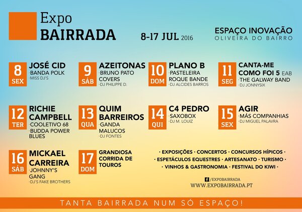 Mikael Carreira, Agir, Richie Campbell, Azeitonas e C4 Pedro no cartaz da ExpoBairrada 2016, que se vai realizar entre os dias ...15 Jun -