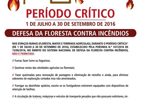No ano de 2016, o período crítico no âmbito do Sistema de Defesa da Floresta Contra Incêndios, vigora de 1 de julho a 30 de ...22 Jun -