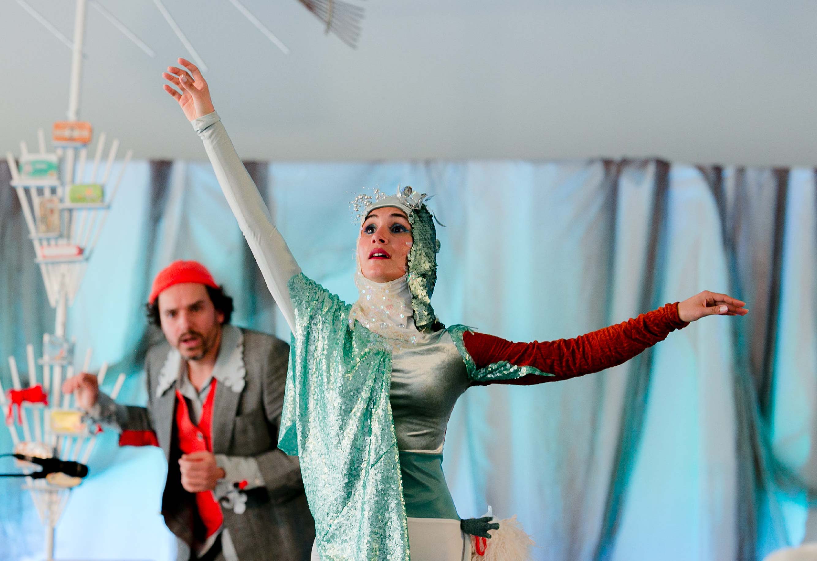 Embalados nas ondas, dois habitantes das mesmas águas que se conhecem, reconhecem semelhanças e diferenças. Tons de cinzento deixam-se contagiar pela irreverência e frescura de muitas cores, gerando uma corrente de melodias e movimentos.
