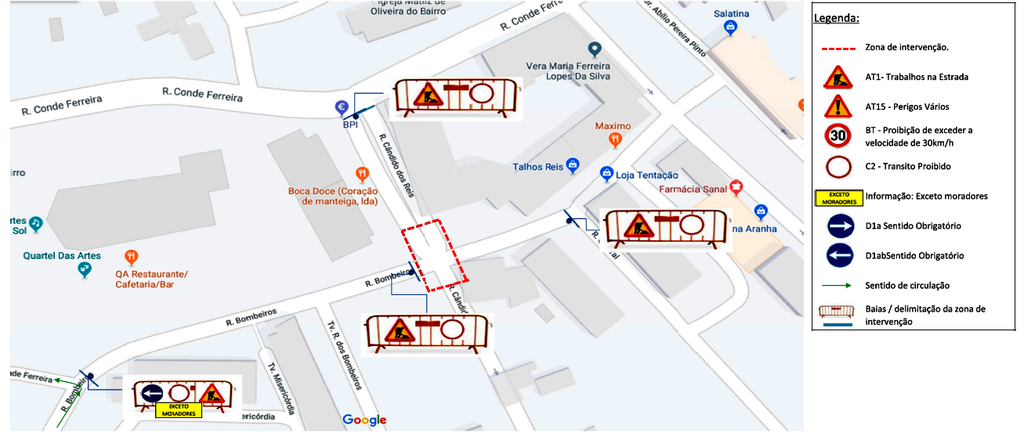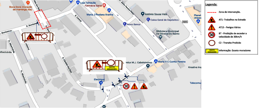 Salientamos que o acesso dos moradores, comerciantes e clientes ao troço entre os balcões do BPI e do Santander só poderá ser feito via Rua Conde Ferreira (Igreja Matriz), saindo, após inversão de marcha, pelo mesmo local.
