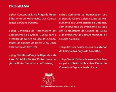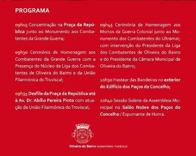 As comemorações, levadas a cabo por todo o país, são assinaladas em Oliveira do Bairro a partir das 9h15, com um programa que contempla cerimónias de homenagem aos Combatentes da Grande Guerra e aos Mortos da Guerra Colonial com a presença do Núcleo da Liga dos Combatentes de Oliveira do Bairro e da Banda Filarmónica do Troviscal, o hastear das Bandeiras no exterior do Edifício dos Paços do Concelho e uma Sessão Solene da Assembleia Municipal Comemorativa do 25 de abril.