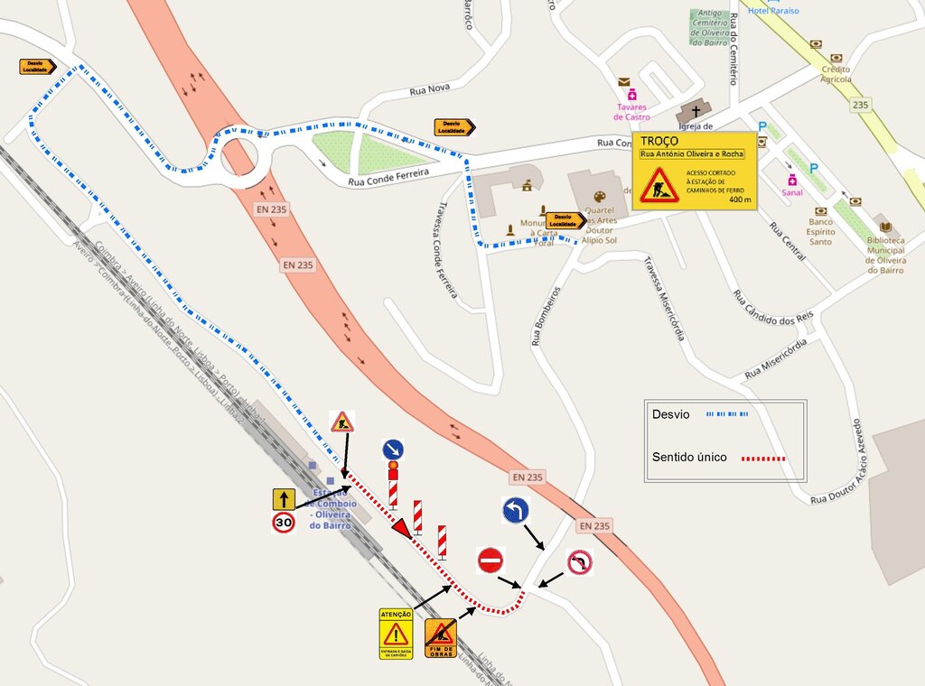 A alteração do sentido de trânsito na Rua António Oliveira e Rocha, aprovada em Reunião de Câmara realizada no dia 29 de março, tem como objetivo garantir a segurança pública na circulação pedonal e rodoviária, durante a execução da obra. Esta alteração vai limitar a circulação entre a Estação e o centro da cidade de Oliveira do Bairro, com a supressão de uma faixa de rodagem, passando a “sentido único”, no troço Estação - Rua Porto da Moita (cortada para a Lavandeira). A circulação só será permitida no sentido ascendente. Esta alteração e a alternativa de percurso mais rápida serão devidamente sinalizadas no local e na área envolvente.