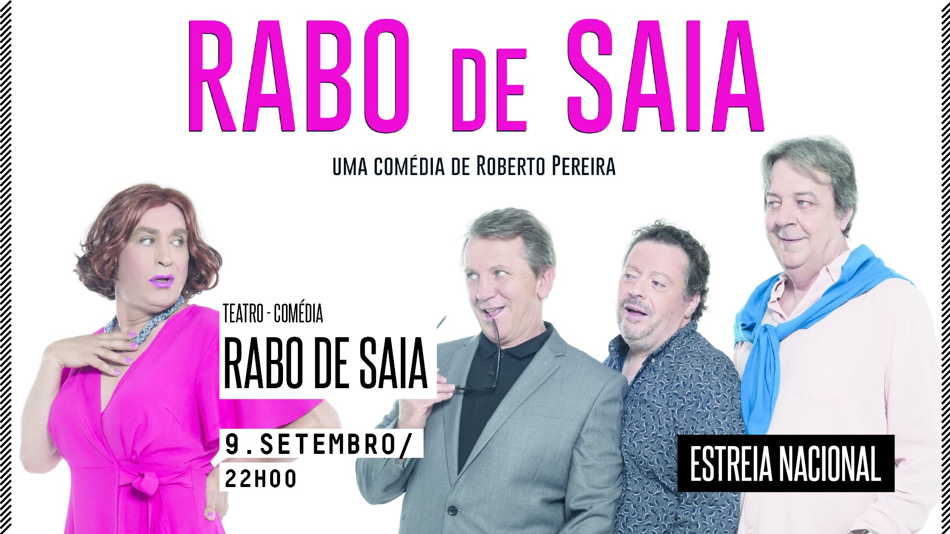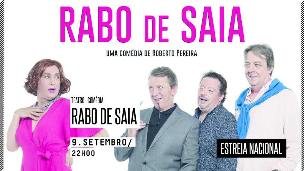 “Rabo de Saia” é uma comédia de Roberto Pereira, produzida pela Margem Narrativa, que reúne em palco Almeno Goncalves, Joaquim Nicolau, António Melo e Fernando Ferrão, atores bem conhecidos que já tiveram oportunidade de passar pelo Concelho de Oliveira do Bairro em anos anteriores, nas peças “Crise dos 40”, “Loucura dos 50” e, mais recentemente e já no palco do QA, em fevereiro deste ano, “As mentiras que os homens contam”, que contou com sessão esgotada.