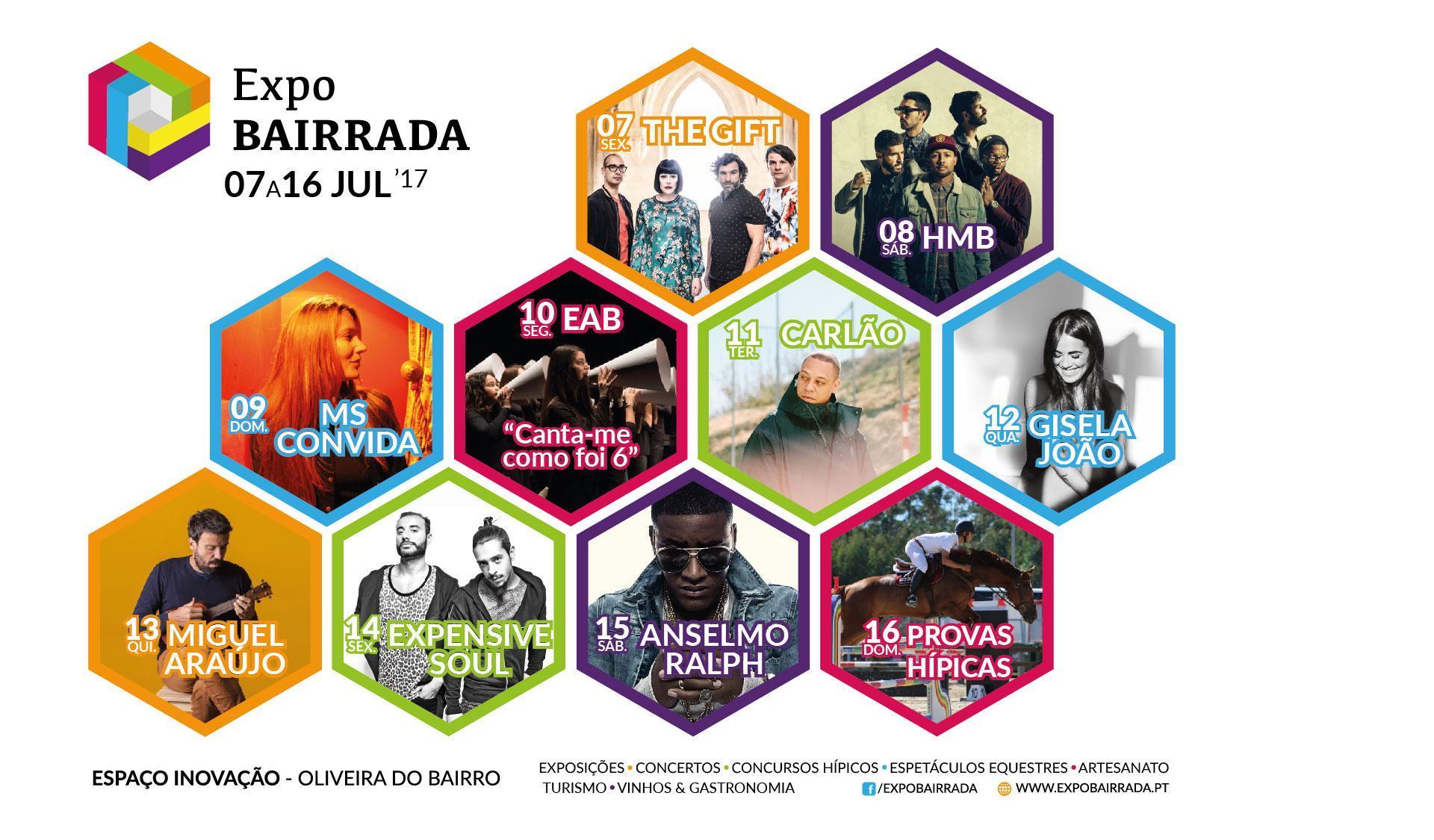 A Expo Bairrada 2017 reúne um cartaz de luxo, com alguns dos nomes mais populares e versáteis da atualidade, numa diversidade de estilos que vai do Pop Rock ao Soul, passando pelo fado. O certame arranca na 6.ª feira, 7 de julho, com os The Gift a subirem ao palco às 23h00, apresentando o seu último trabalho ALTAR - um sonho tornado realidade, produzido pelo icónico Brian Eno e misturado por Flood. Um projeto de vida que se realiza em 2017 com canções, intemporais. Na noite de sábado, 8 de julho, estreiam-se os HMB, a banda portuguesa de soul e funk constituída por Héber Marques, Fred Martinho, Daniel Lima, Joel Silva e Joel Xavier, que prometem por o público a dançar no Espaço Inovação, num concerto em que vão tocar os seus grandes êxitos. O talento local sobe ao palco com Marisa Silva e convidados, no dia 9 de julho, e a 6.ª Edição do espetáculo “Canta-me como foi”, produzido pela Escola de Artes da Bairrada, no dia 10. Na terça-feira, 11 de julho, a noite é de Carlão, o vocalista e letrista que ficou conhecido do público como uma das caras dos saudosos Da Weasel. O Fado regressa ao palco principal do Espaço Inovação no dia 12, com mais uma estreia em Oliveira do Bairro: Gisela João. Três anos depois do seu álbum de estreia, a fadista promete um espetáculo de grande qualidade musical na companha de Ricardo Parreira na Guitarra Portuguesa, Nelson Aleixo na Viola de Fado e Francisco Gaspar na Viola Baixo. Na quinta-feira, 13 de julho, Miguel Araújo regressa a Oliveira do Bairro, depois de passagens com Os Azeitonas, em 2016, e já este ano, em nome individual, com um espetáculo inesquecível no Quartel das Artes Dr. Alípio Sol. Para além dos seus temas mais conhecidos o “cantautor” vai trazer-nos outros temas de “Giesta”, o seu mais recente trabalho.