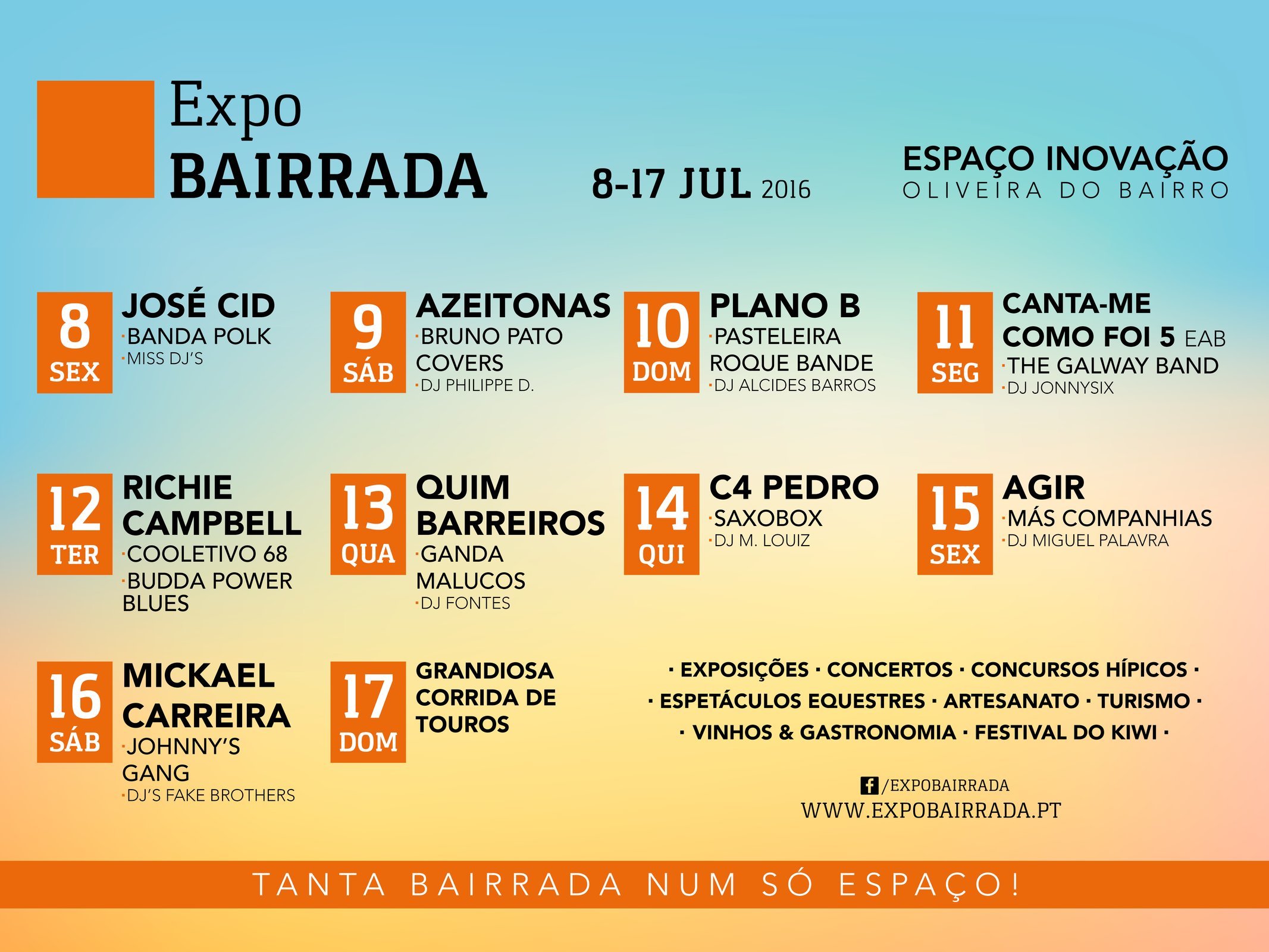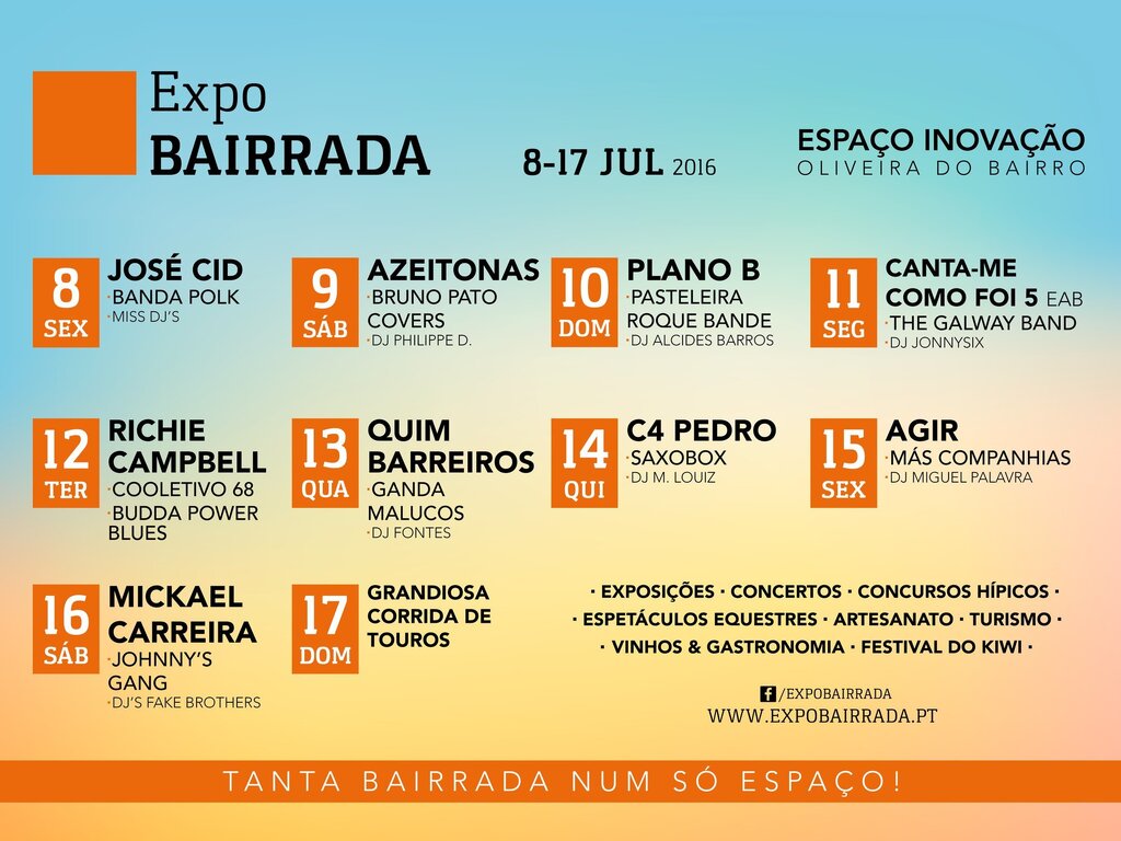 Ao longo dos 10 dias, de 8 a 17 de julho, o programa da ExpoBairrada apresenta um cartaz de espetáculos verdadeiramente irresistível, que procura ir ao encontro de todas as gerações e vai muito além dos cabeças de cartaz das várias noites. A aposta no desporto equestre sai também reforçada, com a realização de vários concursos nacionais de Saltos, de Modelo e Andamentos e ainda de Atrelagens, que vão decorrer ao longo de todo o evento.