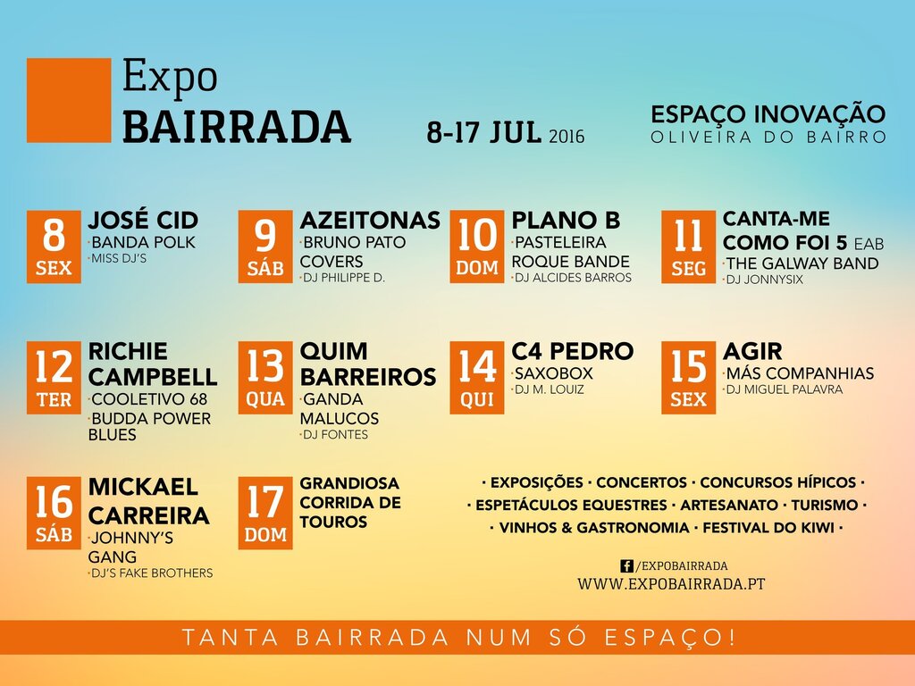 Como tem sido tradição, José Cid “abre” o certame na 6.ª feira, 8 de julho, com mais um concerto onde os seus maiores êxitos, verdadeiramente transversais a todas as idades, serão ouvidos e cantados em uníssono por milhares de pessoas. Na noite seguinte, sábado, estreiam-se em Oliveira do Bairro Os Azeitonas, com o seu Pop Rock sofisticado e divertido, que vão levar o público a “ver os aviões”* no Espaço Inovação (*música “Anda comigo ver os aviões). Richie Campbell regressa ao palco da ExpoBairrada na 3.ª feira, dia 12, trazendo consigo a energia e os sons da Jamaica, para mais um espetáculo memorável. 4.ª feira é dia de música popular com Quim Barreiros, que fará a festa com a sua boa disposição e os seus êxitos “picantes” que agradam a todas as gerações. Também em estreia no Espaço Inovação, estará o eclético músico angolano C4 Pedro, na 5.ª feira, noite em que os sons africanos serão reis. 6.ª feira é dia de Agir. O jovem produtor e músico, que vai atuar também pela primeira vez para o público oliveirense, traz consigo R&B e Hip Hop, entre outros géneros, num espetáculo onde não faltarão temas como “Make Up” ou “Como ela é bela”. O clã Carreira regressa à ExpoBairrada, desta vez com Mickael, que apresentará um espetáculo inesquecível, cheio de êxitos em que o romantismo se veste entre o pop e a música de acento latino. Mais uma noite em que se esperam milhares de pessoas, de toda a região, para aplaudirem o talento e carisma de Mickael Carreira.