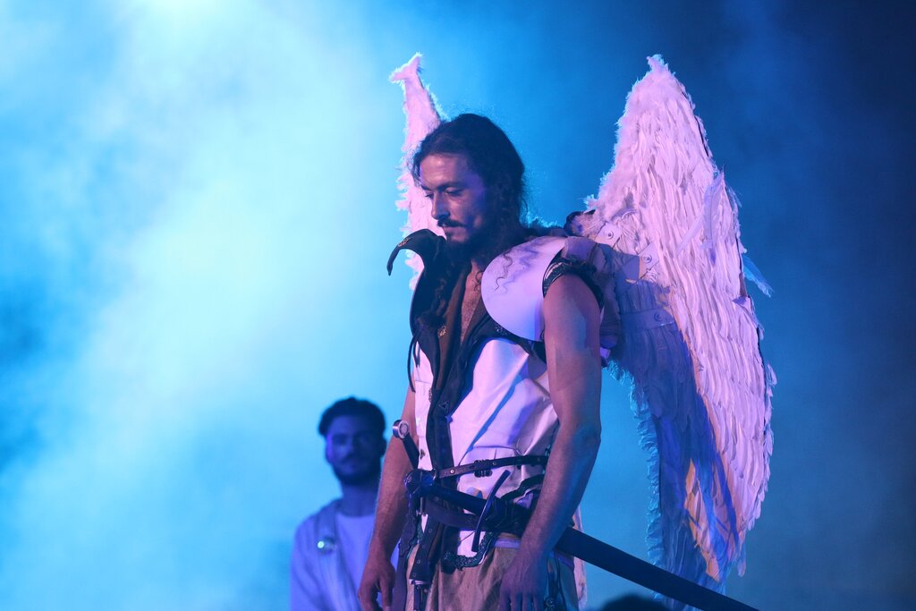 Produzido pela “Viv’Arte | Companhia de Teatro – Laboratório de Recriação Histórica” especialmente para as Festas da Cidade de Oliveira do Bairro, este espetáculo surpreendeu as muitas pessoas que estavam no local, pela qualidade e diversidade de artes performativas que englobou, que passaram pela música, pelo teatro e pela dança, entre outras, destacando-se a surpreendente aparição de dois acrobatas, que dançaram, pendurados por uma corda, na parede do Quartel das Artes Dr. Alípio Sol, que servia de enquadramento à história de S. Miguel Arcanjo. A luz, o fogo, a água e a música tocada ao vivo serviram de forma magnífica e sonora e visualmente extraordinária a narrativa que ia sendo apresentada.