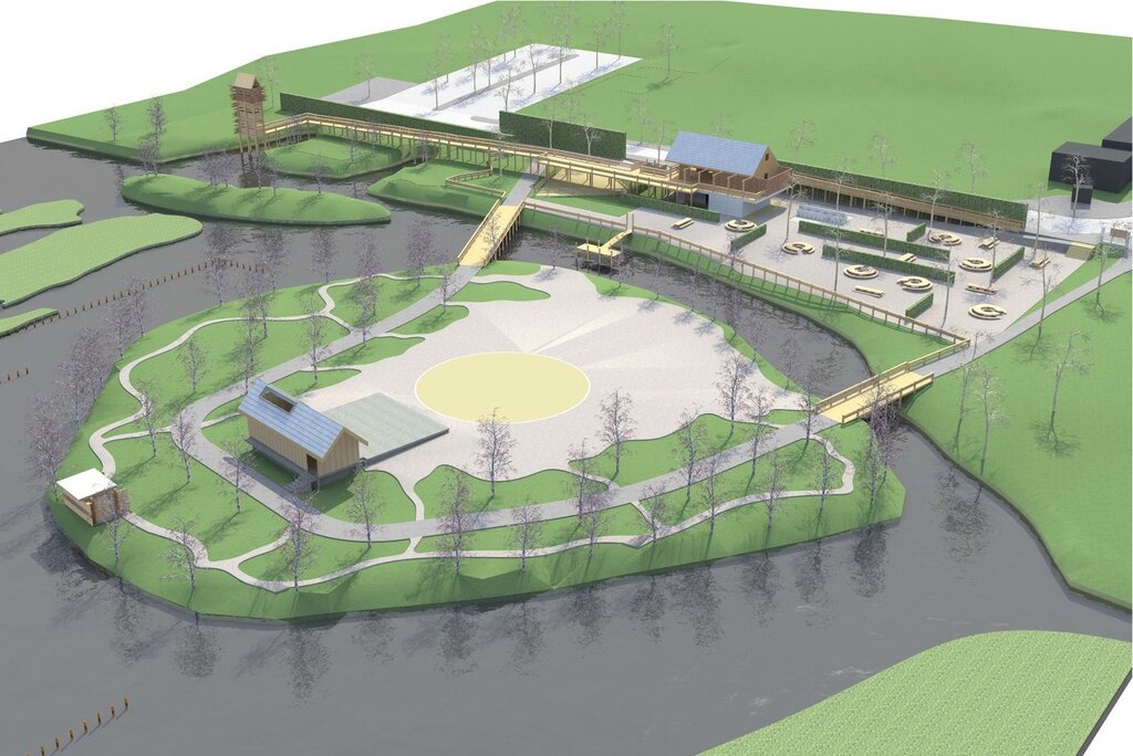 O espaço apresenta percursos em madeira sobre-elevados, estruturas de birdwatching, um palco, um parque infantil, uma zona de convívio com mesas, bancos e churrasqueiras e ainda um edifício/bar com esplanada, que serve de apoio ao espaço envolvente mas que também serve refeições, lanches e petiscos.