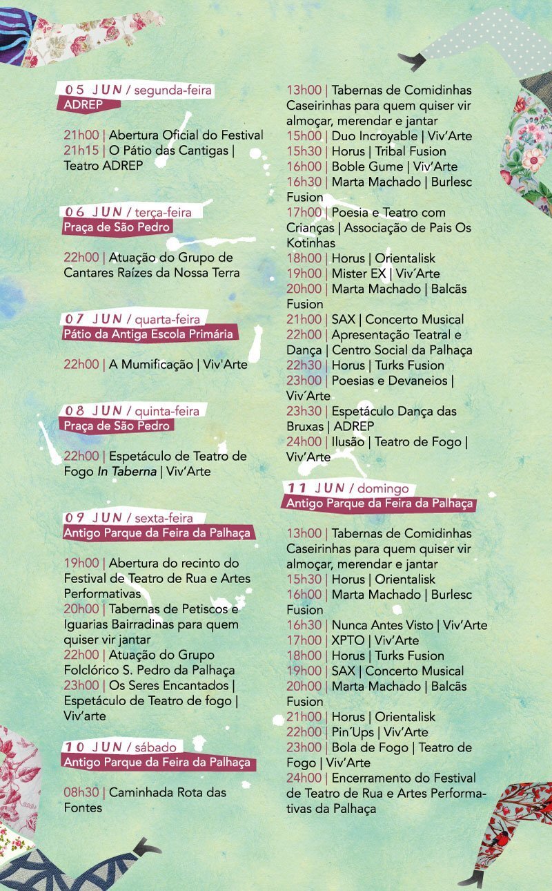 A vila da Palhaça vai receber entre 5 e 11 de junho o Festival de Teatro de Rua e Artes Performativas, evento promovido pela Câmara Municipal em parceria com a Junta de Freguesia local e a Viv’Arte | Companhia de Teatro – Laboratório de Recriação Histórica, envolvendo ainda várias entidades, escolas e associações concelhias.