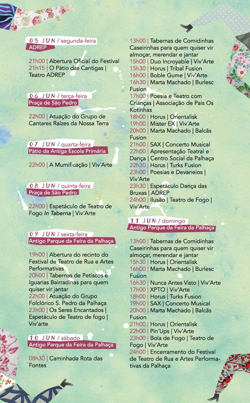 O programa do evento, que vai acontecer em vários locais da vila, desde o anterior largo da Feira da Palhaça, passando pela antiga escola primária e instalações da Associação Desportiva Recreativa e Educativa da Palhaça (ADREP), contará com várias atividades das quais se destacam espetáculos de teatro de fogo, artes performativas, teatro de rua e burlesco ou ainda concertos etnográficos de vários pontos do mundo, que fazem antever um festival que aposta na inovação, absolutamente diferenciador, com muita animação, cor e vida.