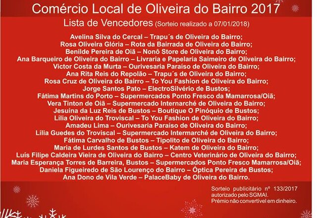 09 Janeiro 2018Sorteio de Natal do Comércio Local de Oliveira do Bairro | Premiados
