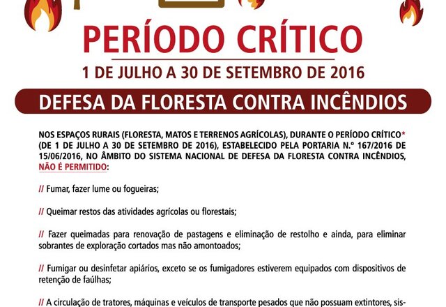 No ano de 2016, o período crítico no âmbito do Sistema de Defesa da Floresta Contra Incêndios, vigora de 1 de julho a 30 de ... -