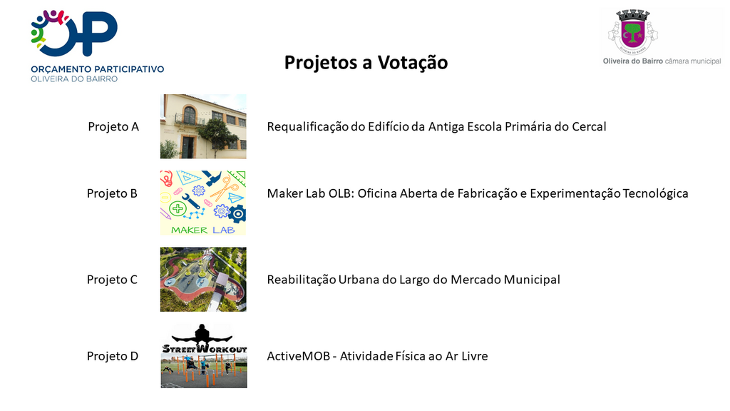 A descrição de cada um dos projetos está disponível para consulta no site da iniciativa, em http://op.cm-olb.pt ou na página de facebook da iniciativa.