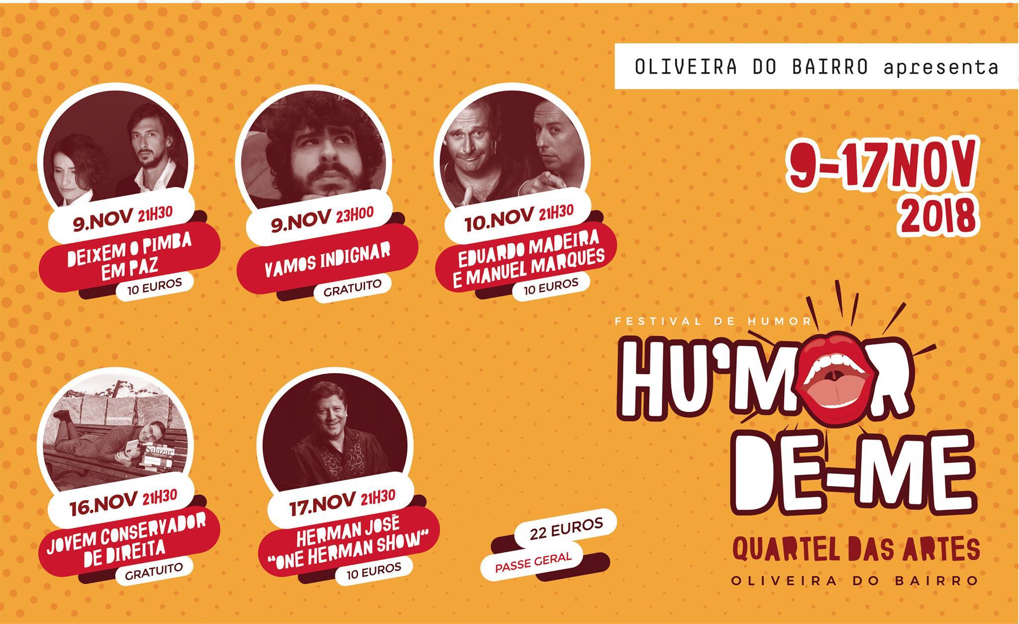 O irreverente Bruno Nogueira e a vocalista dos Clã Manuela Azevedo abrem o festival no dia 9 de novembro (6.ª feira), às 21h30, com o seu projeto musical “Deixem o Pimba o Paz”, apresentando músicas de Quim Barreiros, Ágata, Marante ou Marco Paulo, em surpreendentes versões com arranjos de jazz e pop. Às 23h00 é a vez de Gonçalo Roque, autor do blogue e livro “Melhor que isto só outra coisa qualquer”, se apresentar no espaço da cafetaria do QA com o espetáculo “Vamos Indignar!”. O humorista, que é natural do Concelho de Oliveira do Bairro, vai contar com a ajuda de dois convidados para conversarem sobre… coisas que (n)os indignam. No dia seguinte, sábado, o Quartel das Artes abre as portas a Eduardo Madeira e Manuel Marques, dois humoristas que dispensam apresentações, com participações em vários programas de televisão e também no cinema, para uma noite de absoluta comédia, com música à mistura.