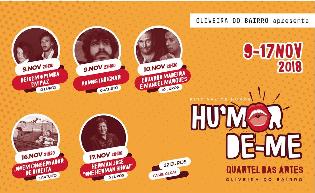 O Quartel das Artes vai promover entre 9 e 17 de novembro a primeira edição do Hu’morde-me – Festival de Humor de Oliveira do Bairro, com nomes como Herman José, Eduardo Madeira, Manuel Marques ou Bruno Nogueira.