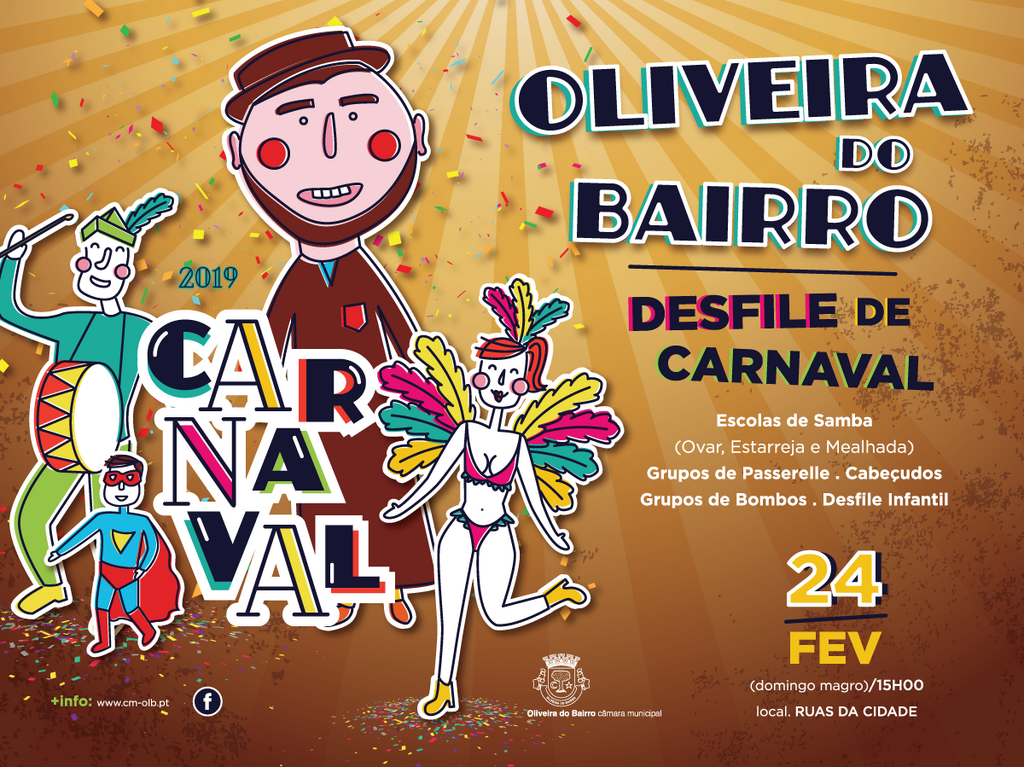 Antecipando os festejos carnavalescos que acontecem um pouco por todo o mundo, o Município de Oliveira do Bairro volta a celebrar o Carnaval no Domingo Magro, dia 24 de fevereiro, com um grande desfile que vai juntar escolas profissionais de samba, oriundas de Ovar, Estarreja e Mealhada, grupos de passerelle, grupos de bombos, cabeçudos e ainda um desfile infantil.