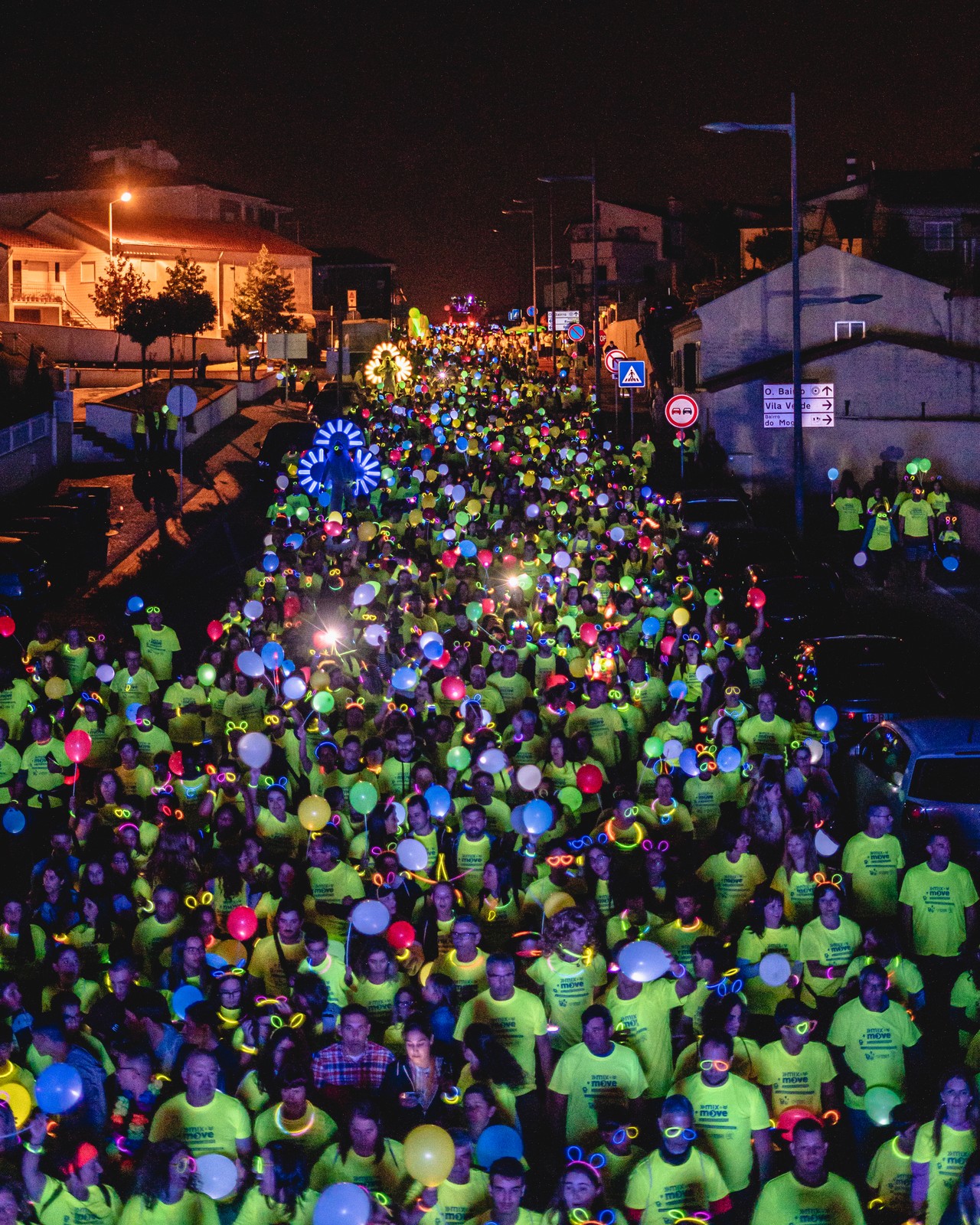 A acompanhar os mais de cinco milhares de participantes (famílias inteiras, netos, filhos e avós, com bebés nos seus carrinhos, grupos de amigos e de colegas de empresa, pessoas em cadeiras de rodas, todos equipados com balões com leds e óculos, bandoletes ou pulseiras de neon, alguns com pijamas ou com disfarces de carnaval) estiveram várias figuras gigantes iluminadas, gigantones e até um grupo de bombos, que deram um colorido e uma animação extra, que a todos surpreendeu. Ao longo do percurso, não faltaram também fogo de artifício, lançamento de confettis e de bolas de sabão em alguns locais, com destaque para o Quartel dos Bombeiros, iluminado a preceito, com jogos de luz de belo efeito e viaturas decoradas.