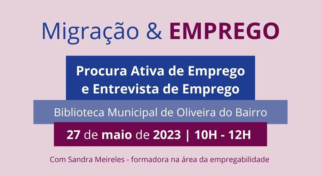 O Município de Oliveira do Bairro vai promover, no dia 27 de maio, pelas 10h00, um workshop intitulado "Procura Ativa de Emprego e Entrevista de Emprego", destinado à população migrante.