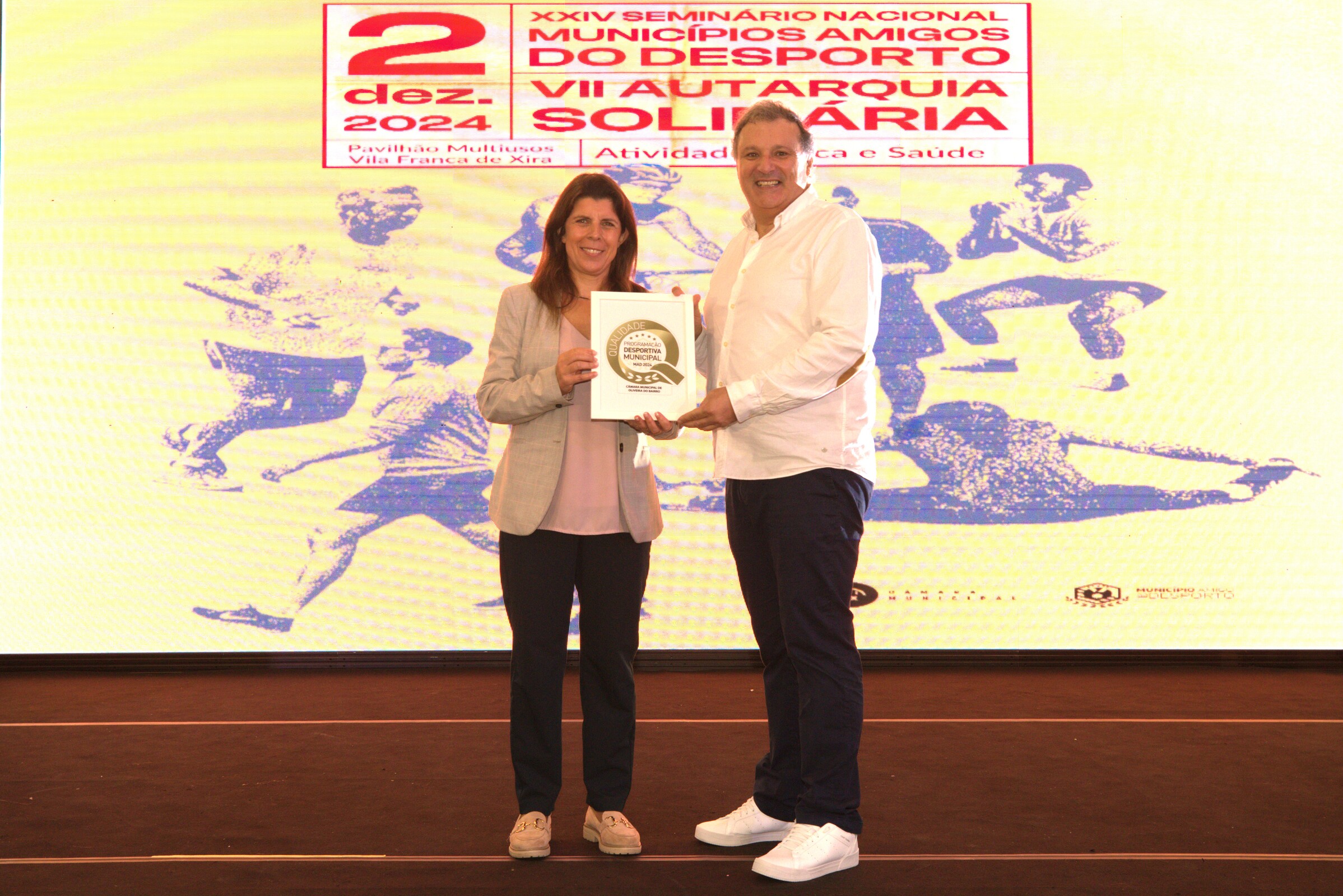 Logo a seguir, no dia 2 de dezembro, em Vila Franca de Xira, o trabalho realizado pela autarquia bairradina foi novamente reconhecido no âmbito do XXIV Seminário dos Municípios Amigos do Desporto. Desta vez, Oliveira do Bairro recebeu o galardão de “Qualidade da Programação Desportiva Municipal” e viu serem reconhecidos dois colaboradores que trabalham nesta área.