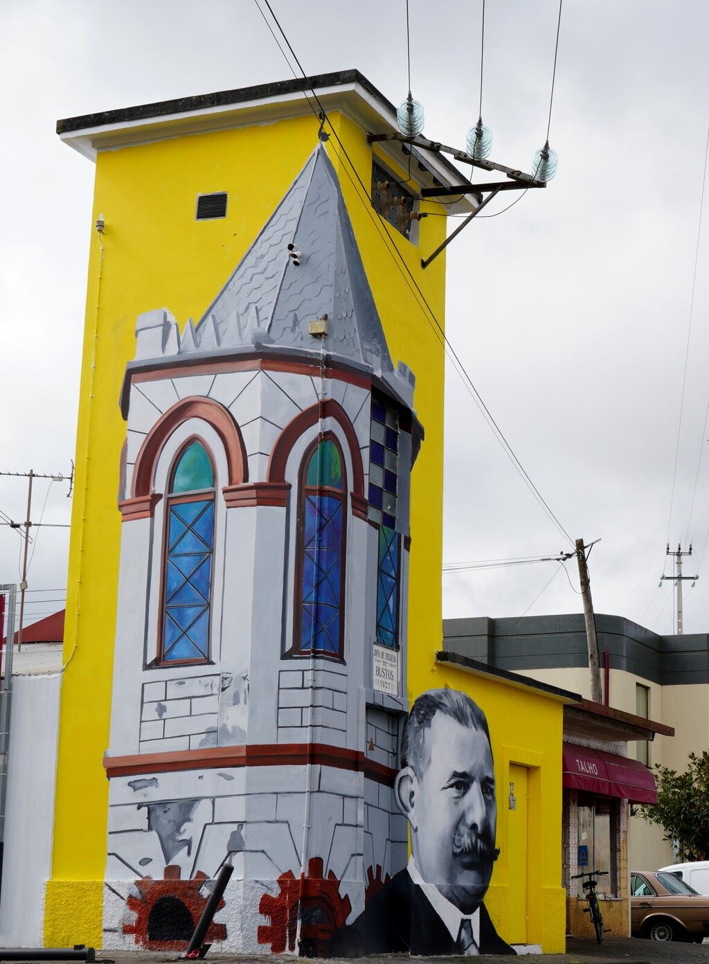 O desafio colocado ao artista foi o de perpetuar a memória do Visconde de Bustos, António Duarte Sereno, figura marcante da vila, assim como o torreão do seu palacete, construído em 1906, que se transformou numa marca icónica e identitária da vila.