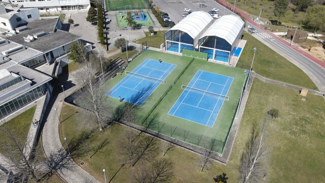 Inseridos numa zona ampla e envolvente, os campos beneficiam de proximidade a outras estruturas, como dois campos de padel, piscinas cobertas, um campo de futebol relvado, um pavilhão multiusos e um parque infantil, além de estacionamento acessível.