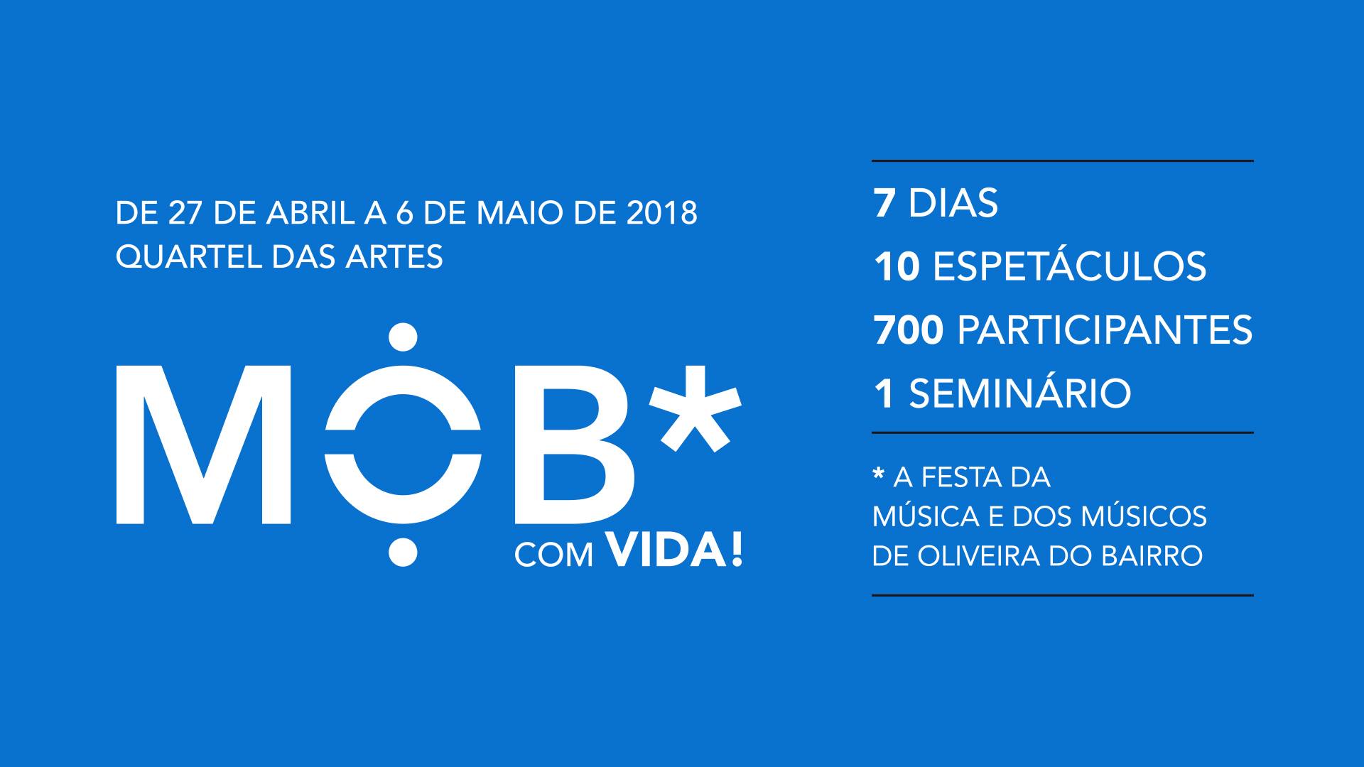 O MOB – Festa da Música e dos Músicos de Oliveira do Bairro regressa ao Quartel das Artes Dr. Alípio Sol entre 27 de abril e 6 de maio, este ano com convidados especiais, como Luis Portugal, Ruizinho de Penacova ou José Cid, este último que será homenageado, a par com Carlos Paião e Zeca Afonso, num espetáculo da Big Band da Bairrada, especialmente constituída para o efeito.